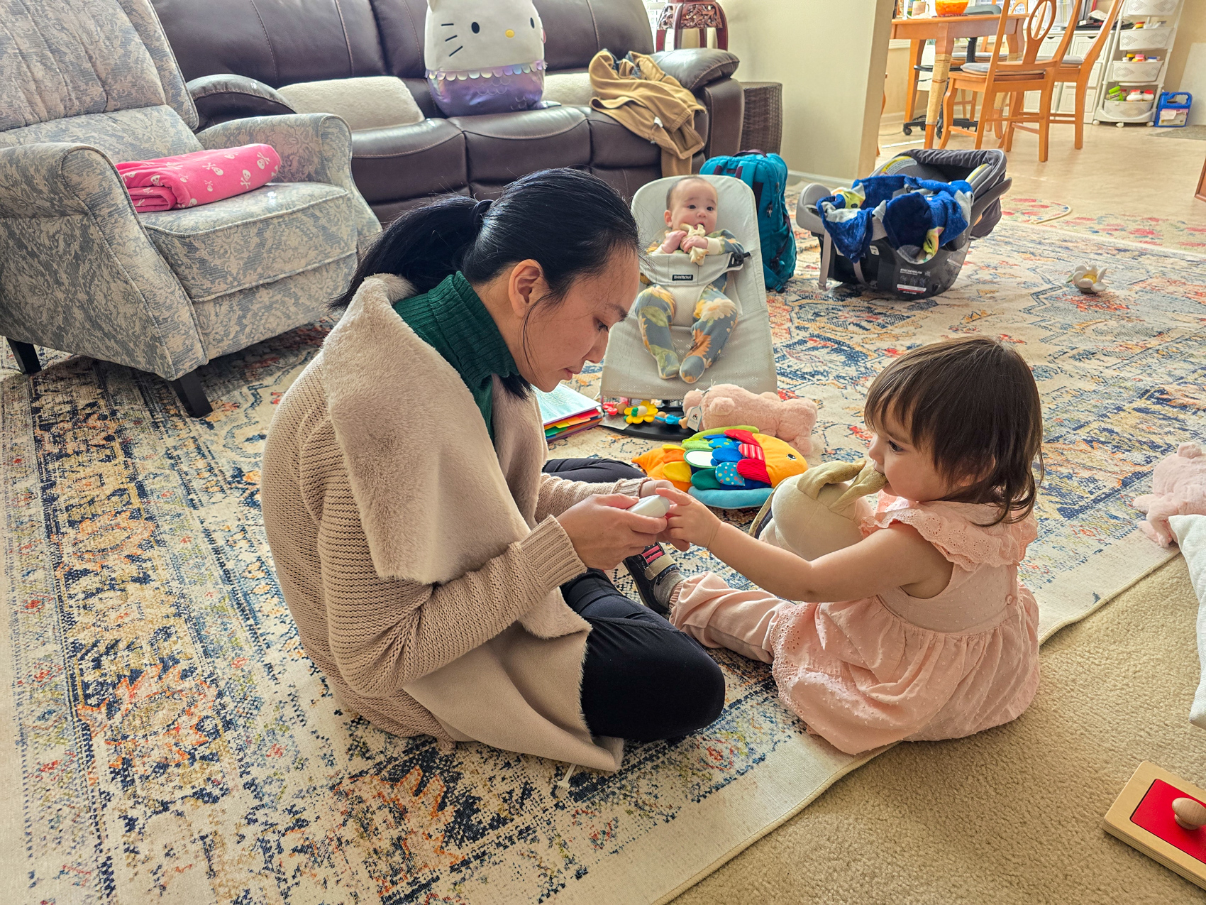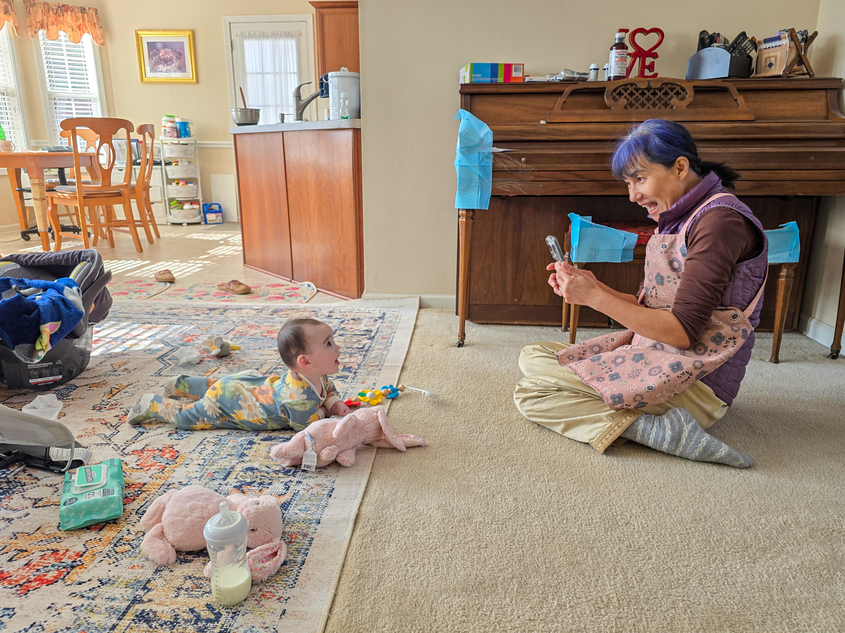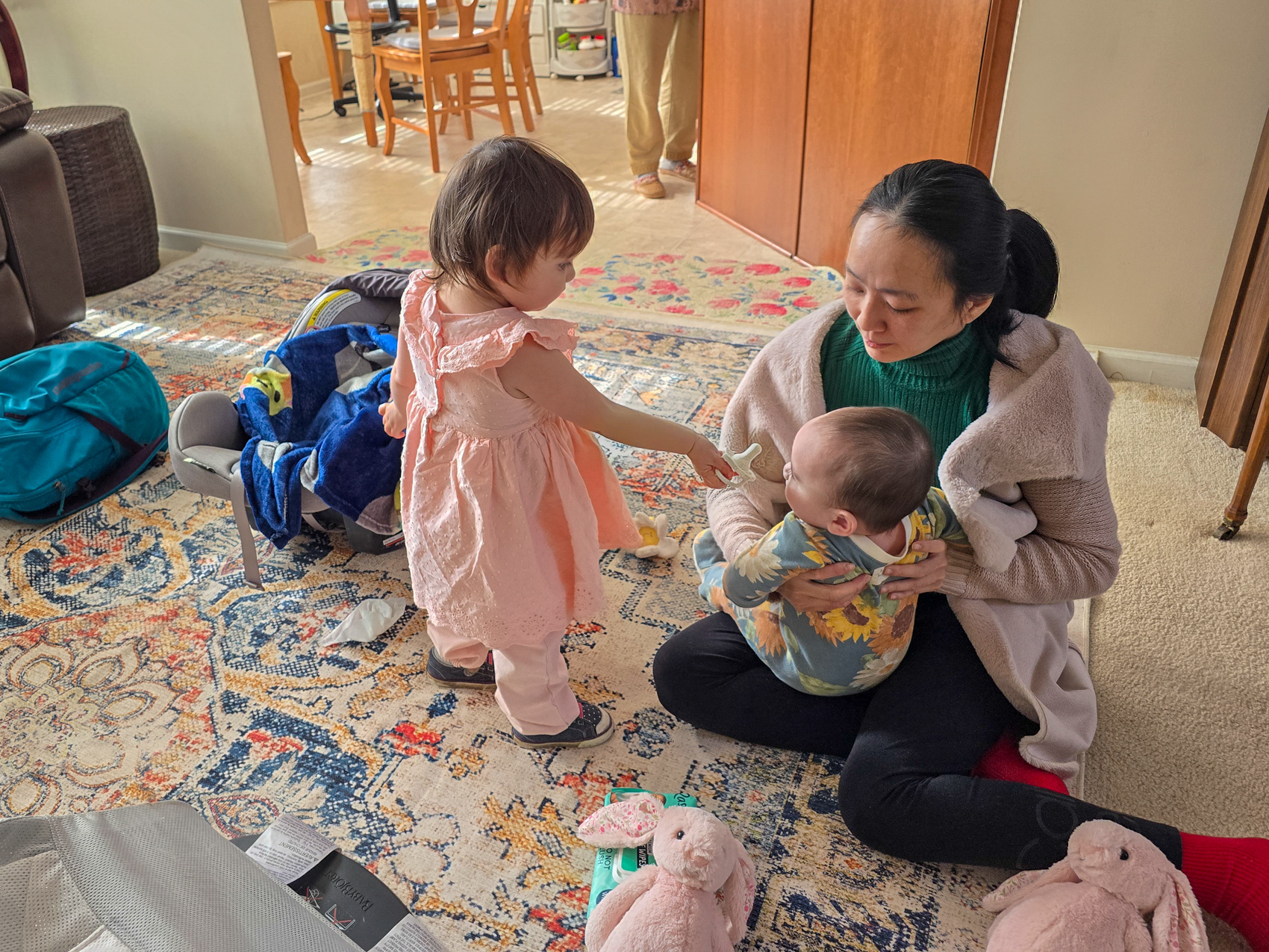 We visited my mom and Doug after leaving Stone Mountain, and when we returned home to Athens Carol Ann helped Louise with the pacifier. Louise is starting to experience pain due to her emerging teeth.